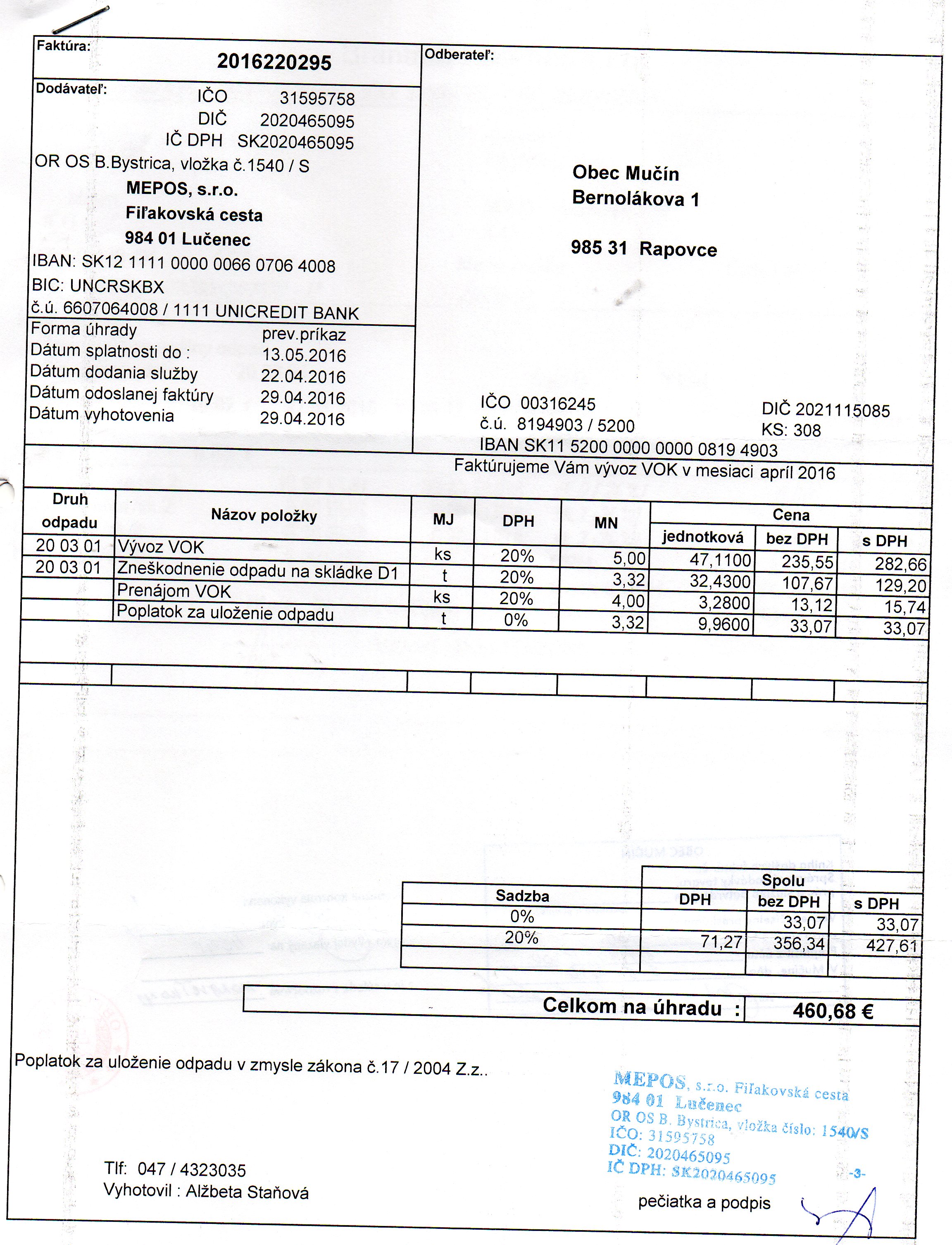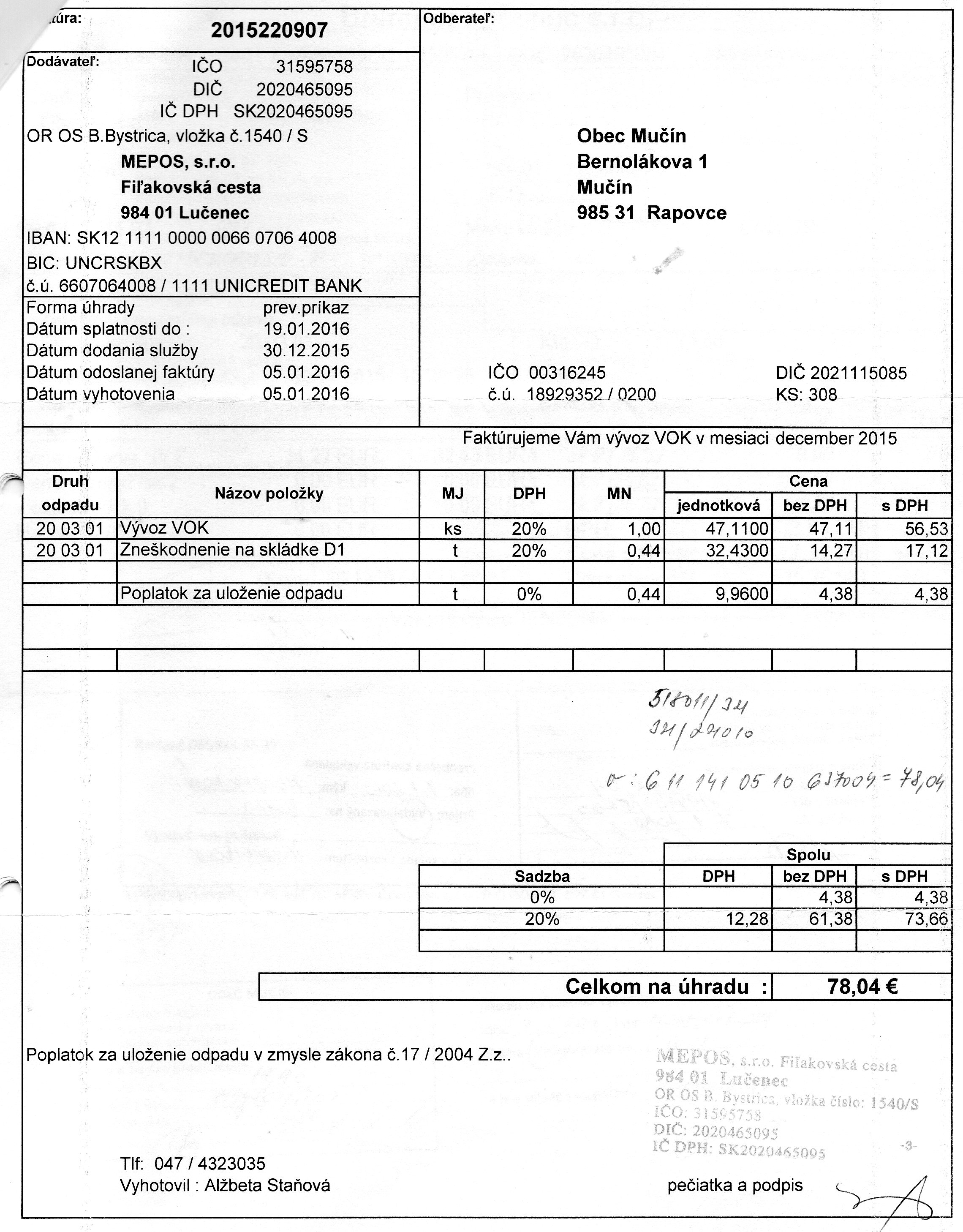 Faktúra č. 2015220678, Suma: 576,01€, Dátum: 19.10.2015, Dodávateľ: MEPOS s.r.o., IČO: 315 95758, DIČ : 2020465095, Predmet: vývoz VOK |