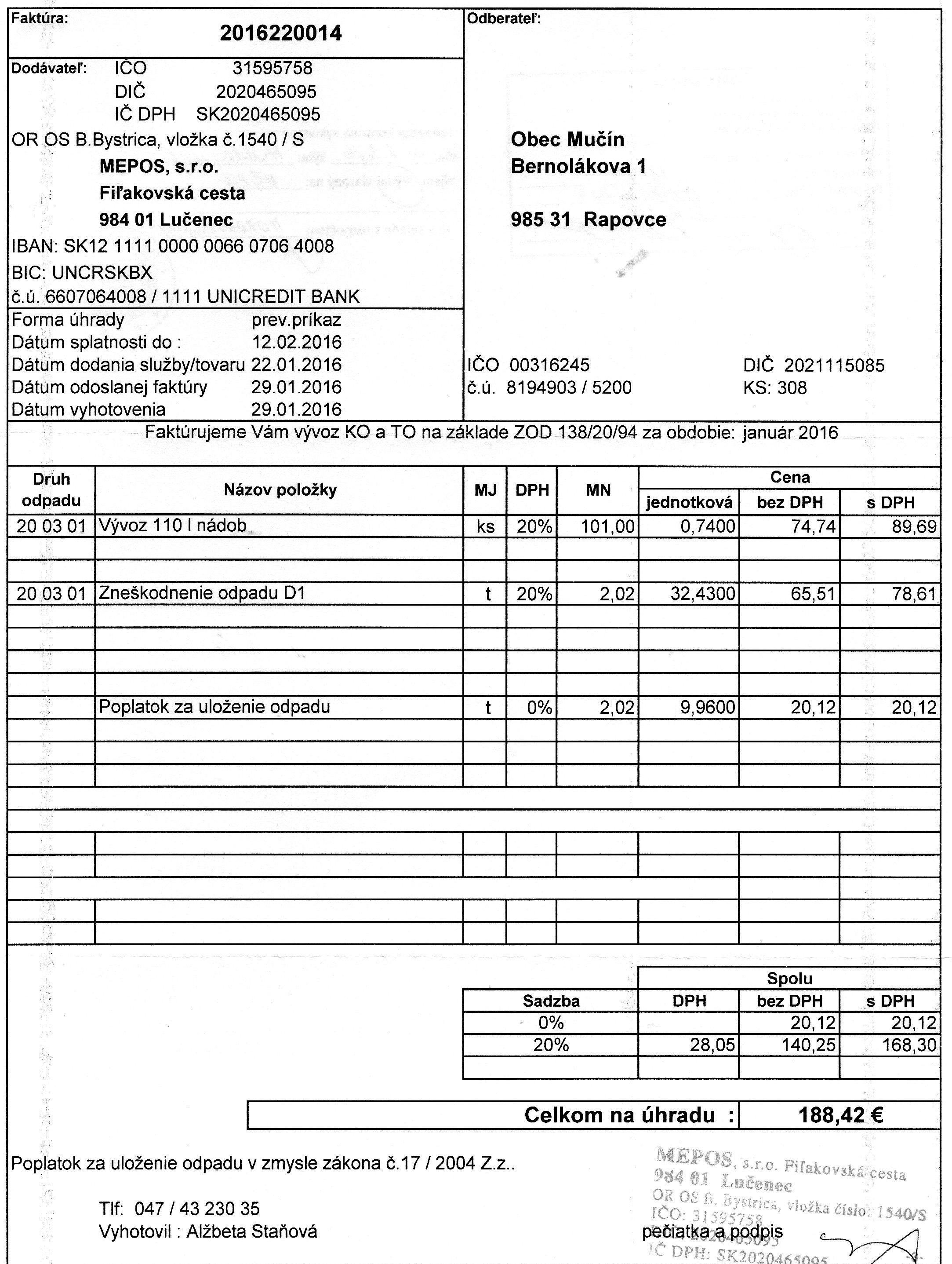 Faktúra č. 2015220662, Suma: 190,29€, Dátum: 19.10.2015, Dodávateľ: MEPOS s.r.o., IČO : 315 95758, DIČ :2020465095, Predmet: vývoz KO a TO |