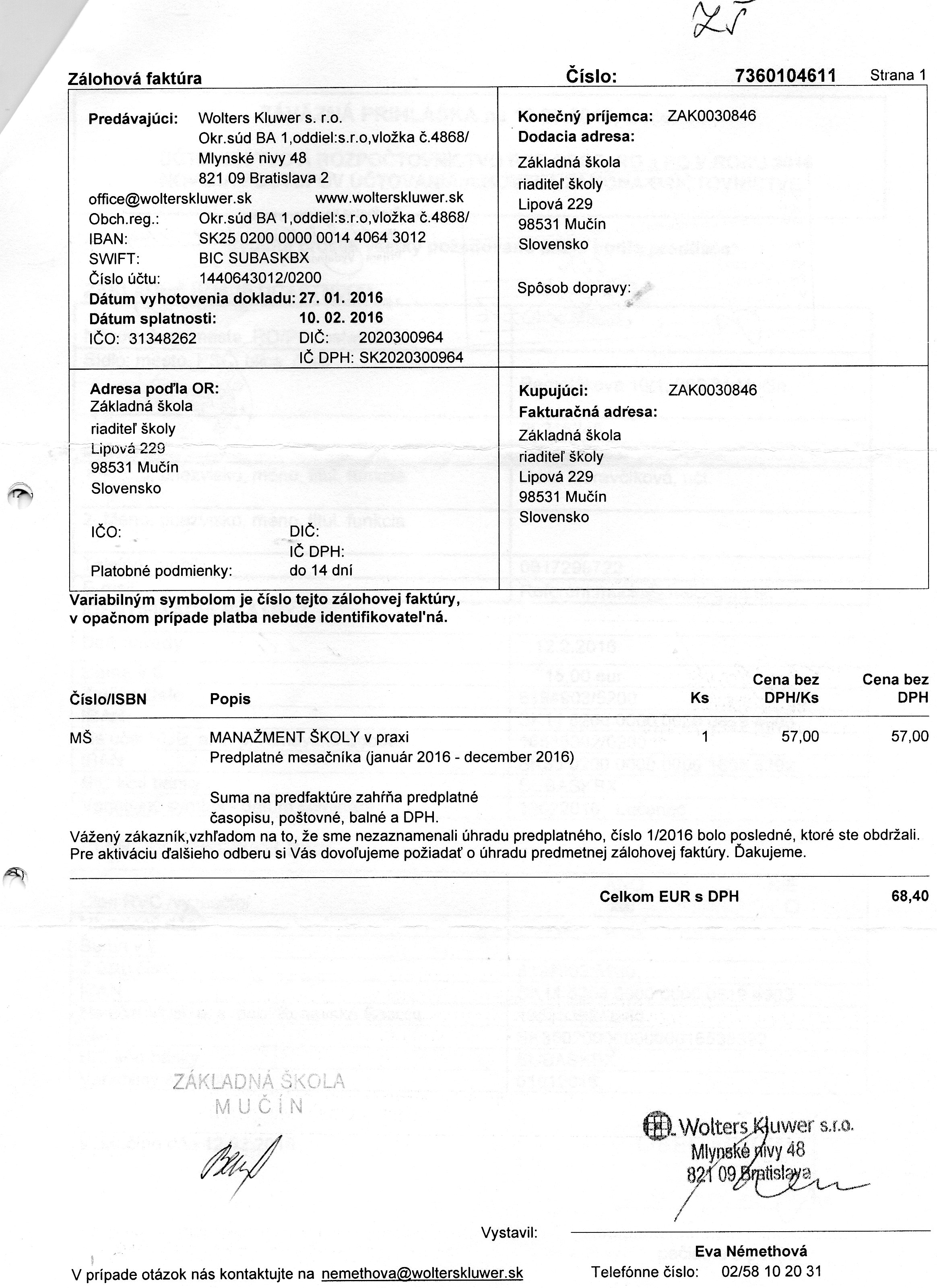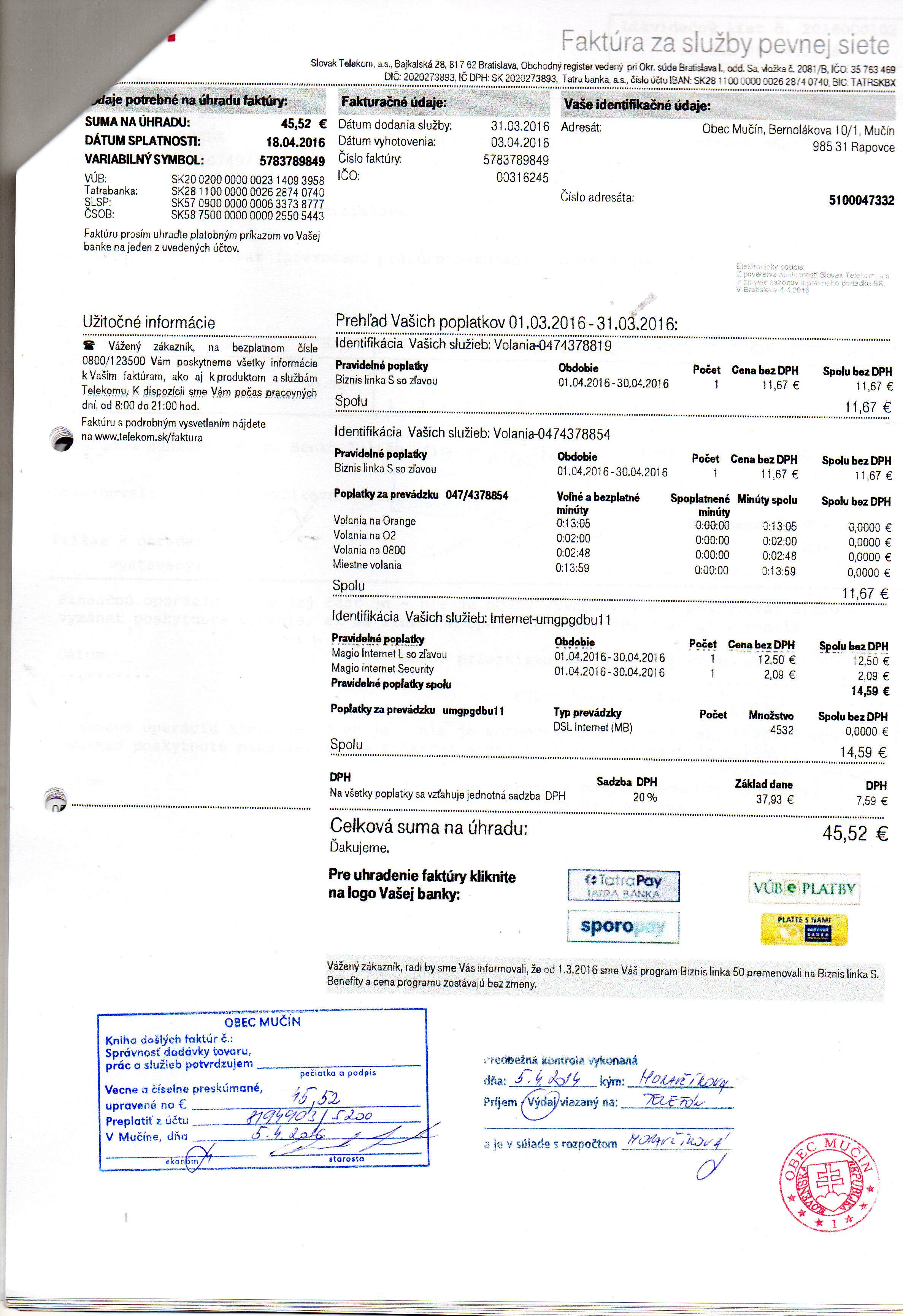Faktúra č. 7509340948,Suma : 18,10 €, Dátum: 22.10.2015, Dodávateľ: Slovak Telekom a.s., IČO: 35 763 469, DIČ : 2020273893, Predmet: za hlasové služby |