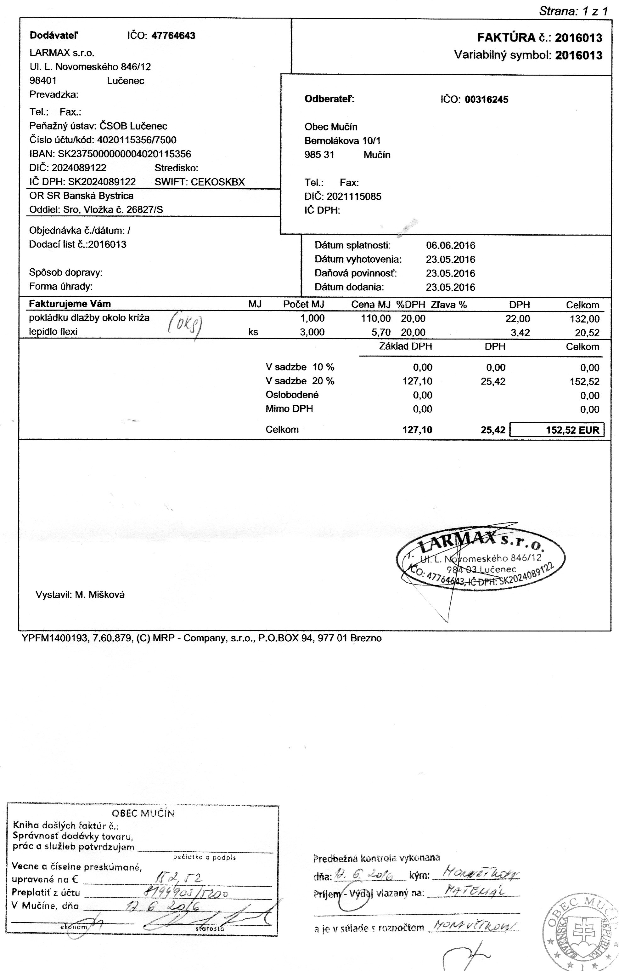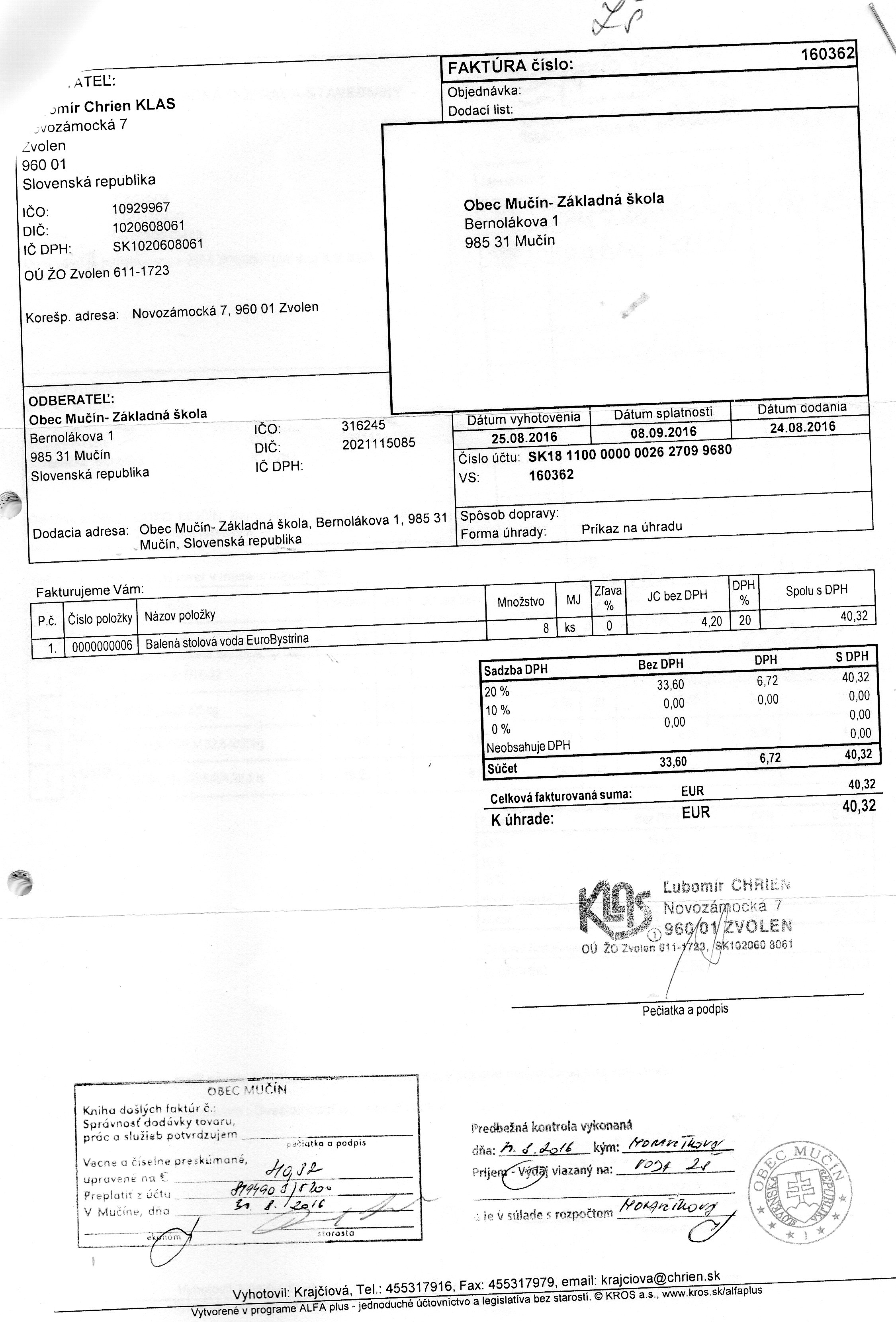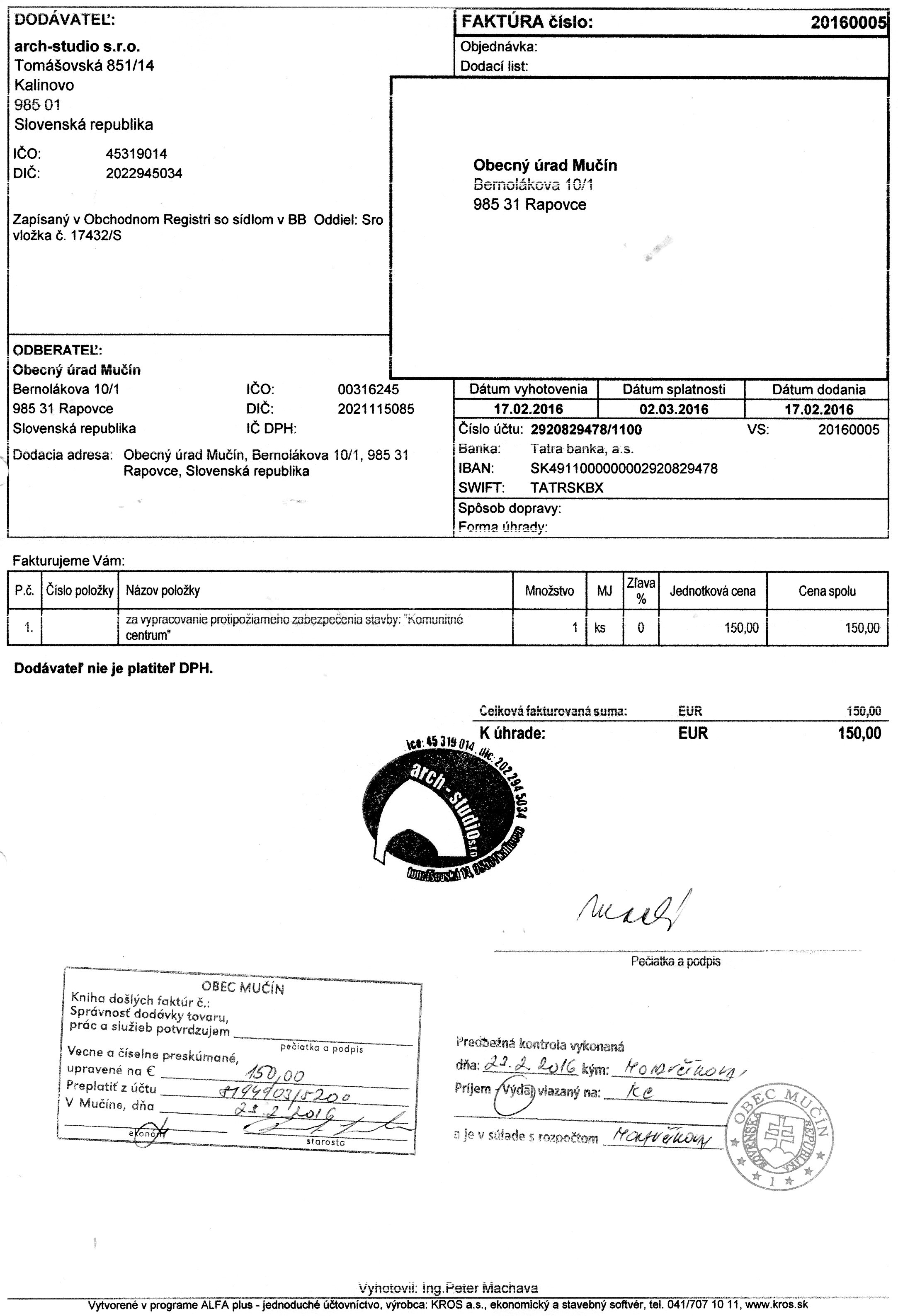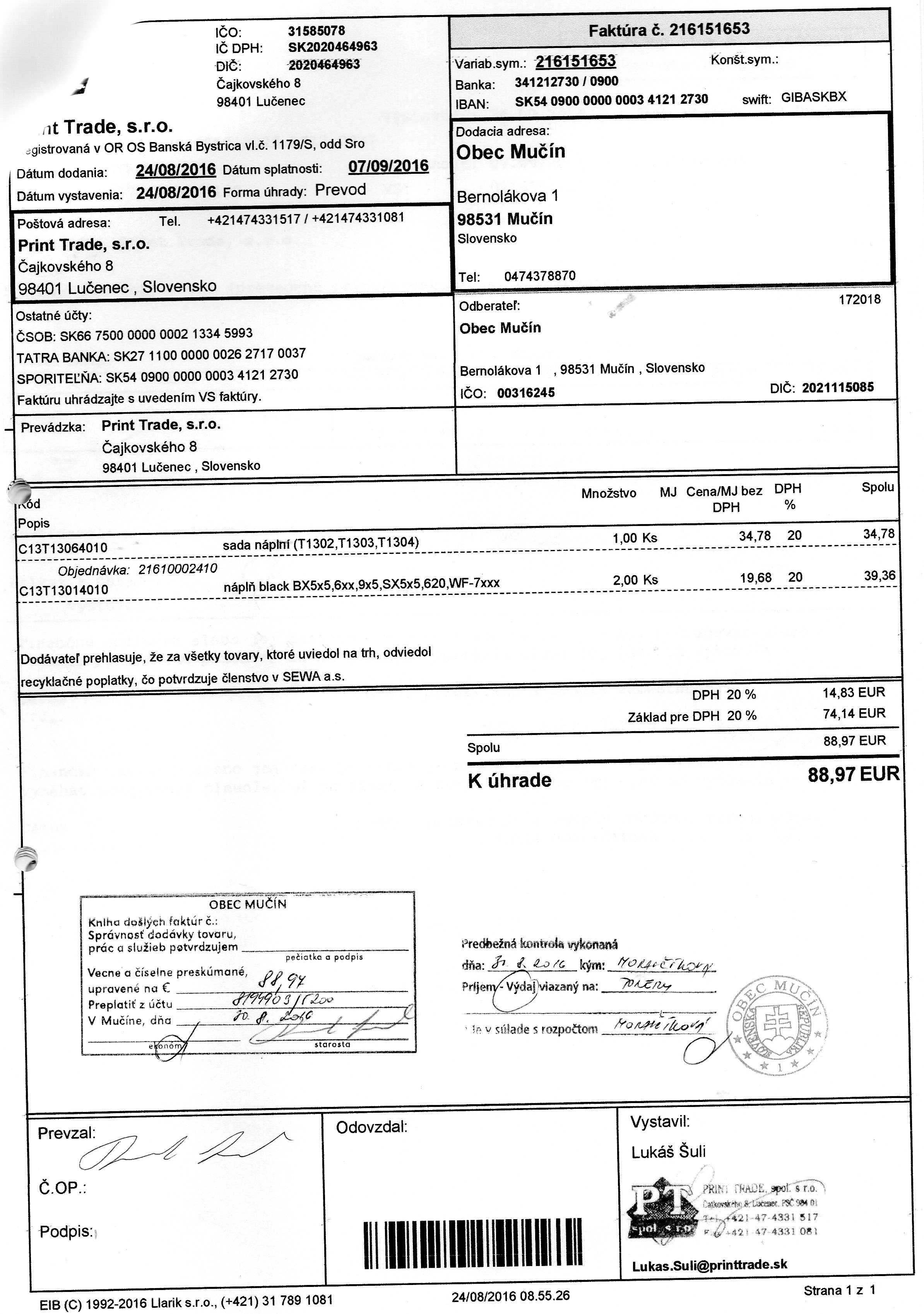 Faktúra č.190508102, Suma: 376,96 €, Dátum: 30.10.2015, Dodávateľ: Tibor Varga TSV Papier, IČO:32627211,DIČ: 1020577811, Predmet: za tovar |