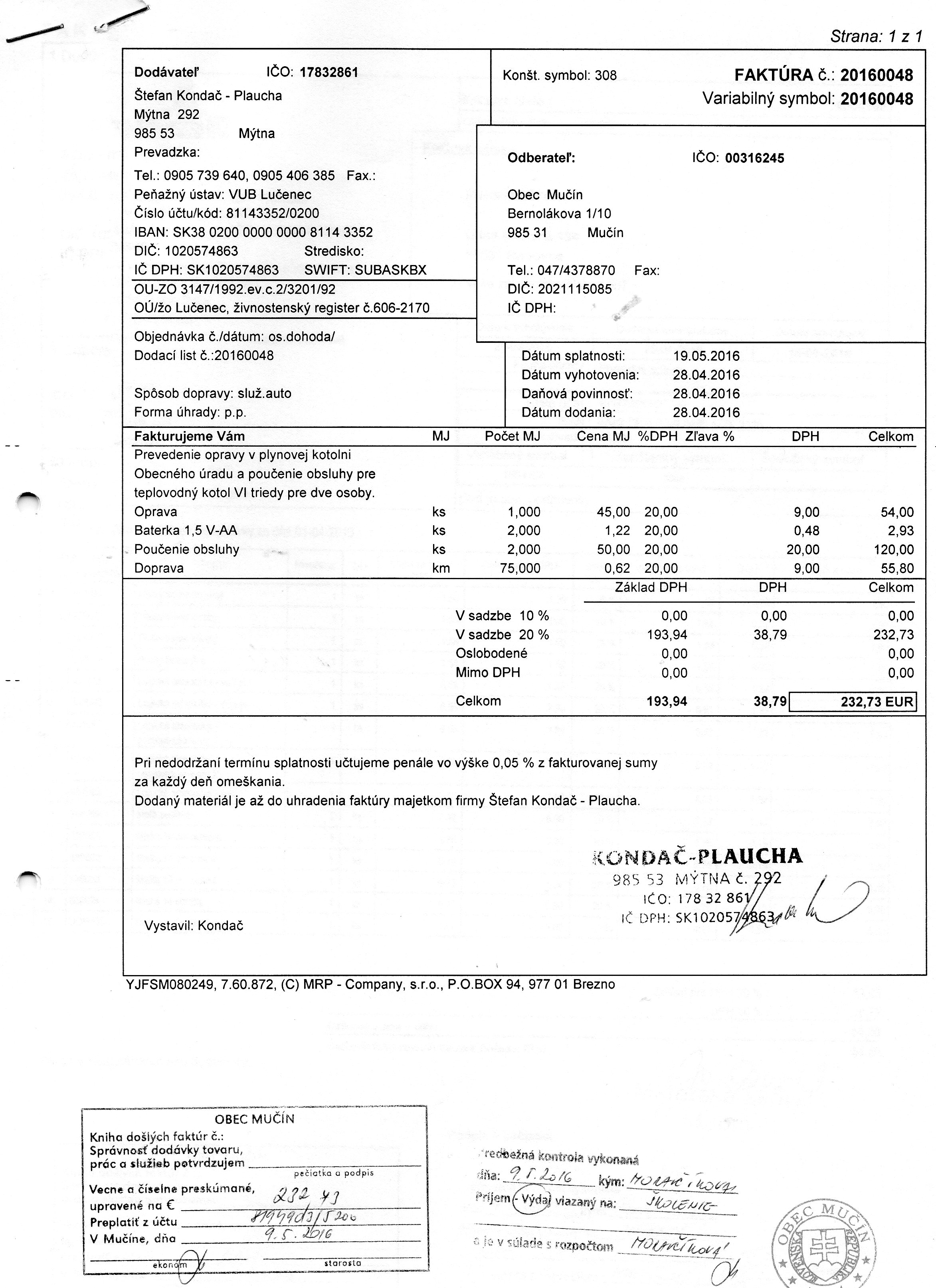 Faktúra č. 0019/2015, Suma: 98 €, Dátum: 12.10.2015, Dodávateľ: Ľuboš Šarovecký, IČO: 43 549 811, DIČ: 1076375333, Predmet: za montáž , |