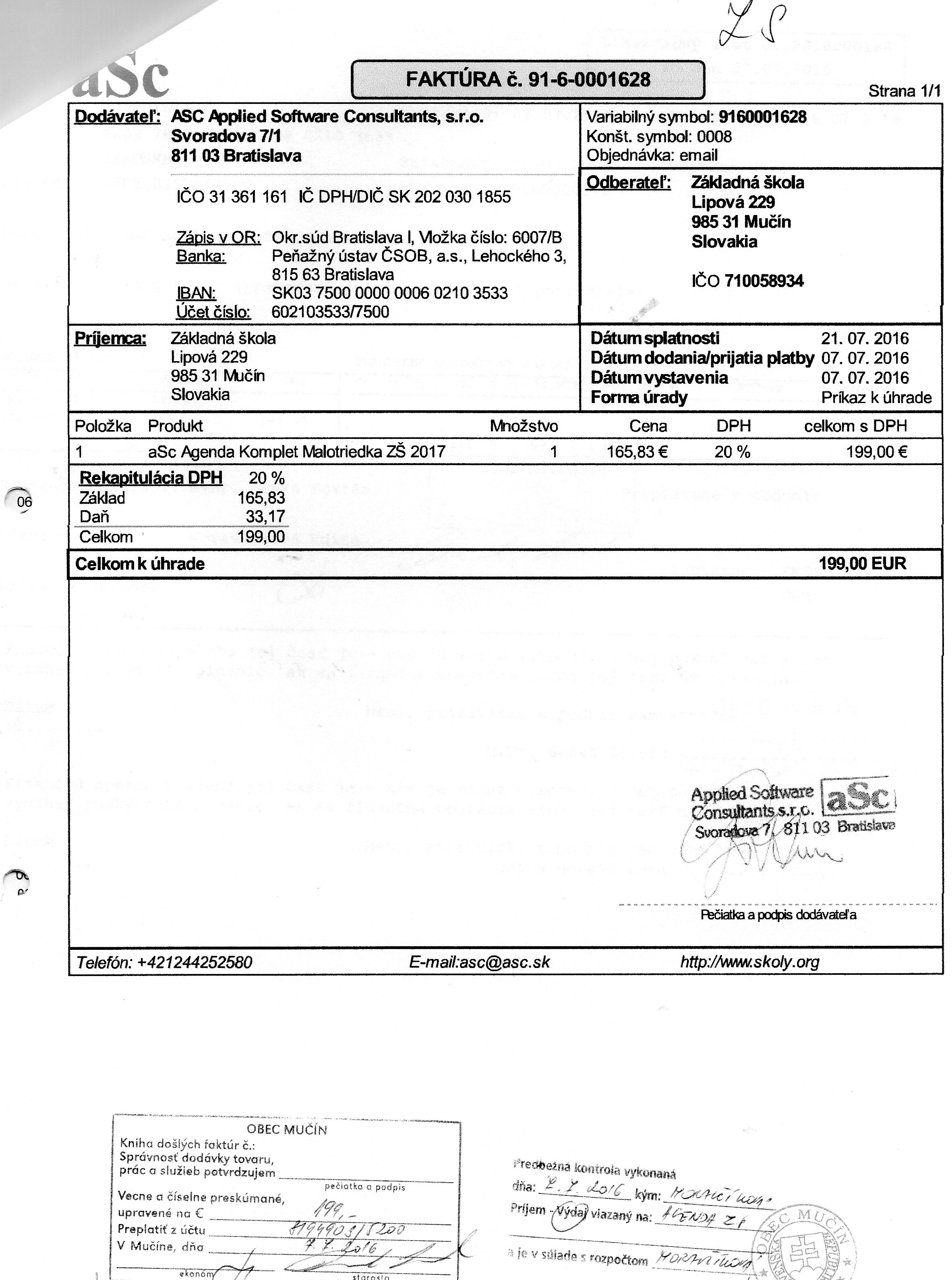 Faktúra č. FV 1500007, Suma: 436,60 €, Dátum: 02.10.2015, Dodávateľ OZ partnerstvo, IČO: 37999290, DIČ: 2022152869, Predmet za služby |