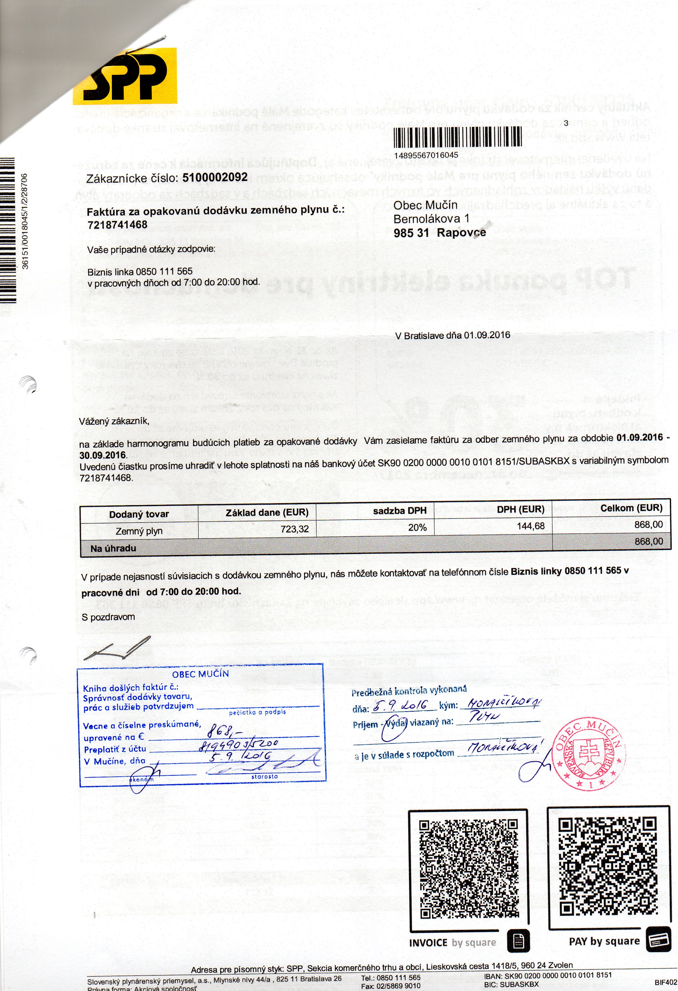 Faktúra č. 7165157263, Suma: 981 €, Dátum: 01.10.2015, Dodávateľ : SPP, IČO: 35815256, IČ DPK : SK 2020259802, Predmet: za odber zem.plynu |