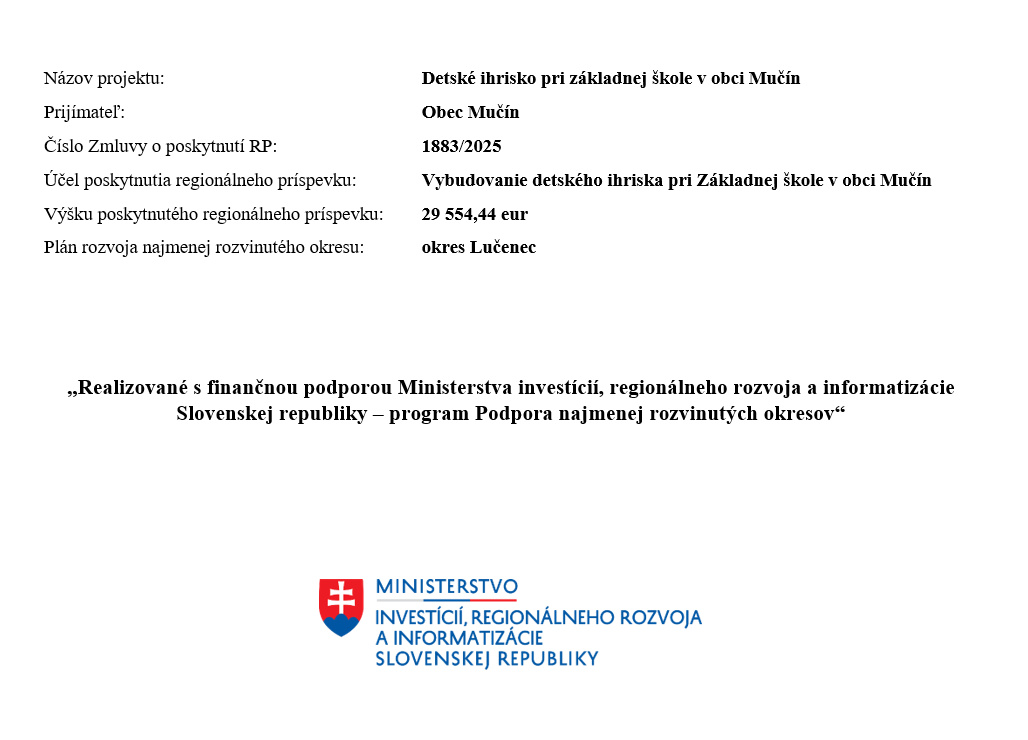 Účel poskytnutia regionálneho príspevku: Vybudovanie detského ihriska pri Základnej škole v obci Mučín